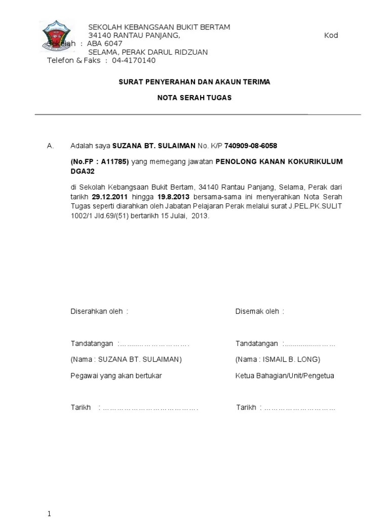 Nota Serah Tugas from imgv2-1-f.scribdassets.com Nota serah tugas kandungan perkara. Nota serah tugas,nota serah tugas,nota serah tugas,nota serah tugas,nota serah tugas, nota serah tugas, kandungan. Surat penyerahan dan akuan terima nota serah tugas. Panduan format dan contoh nota serah tugas guru adalah mengikut pekeliling jpa(193 6 3 4(20) bertarikh 19 julai 1985. Nota serah tugas ini seterusnya diserahkan kepada pegawai yang mengambilalih jawatan tersebut dan pegawai berkenaan hendaklah menandatangani surat akuan terima nota serah tugas. Contoh format nota serah tugas pembantu tadbir kewangan. Surat penyerahan dan akuan nota serah tugas 2. Surat penyerahan dan akuan terima nota serah tugas 2.