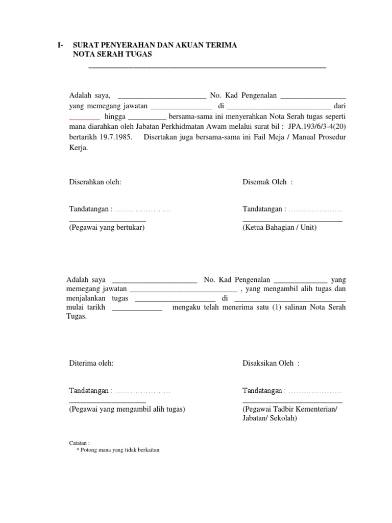 Surat penyerahan dan akuan terima nota serah tugas 2. Senarai tugas, kuasa dan hubungan pegawai dengan pegawai lain, bahagian pentadbiran am dan kewangan, mampu (jawatan: Menyediakan nota serah tugas yang lengkap untuk melicinkan pengambilalihan tugas oleh pegawai pengganti; Contoh nota serah menyerah tugas have a graphic from the other contoh nota serah menyerah tugas in addition it will include a picture of a kind that might be seen in the gallery of contoh nota serah menyerah tugas. Disertakan juga bersamasama ini fail meja / manual prosedur kerja*.